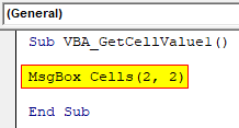 Sub VBA_GetCellValue1() MsgBox Cells(2, 2) End Sub