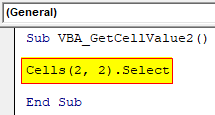 Sub VBA_GetCellValue2() Cells(2, 2).Select End Sub