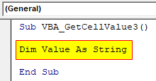Step 2: In the name of VBA Get Cell Value as shown below. And in that, first, define a variable as String using DIM.