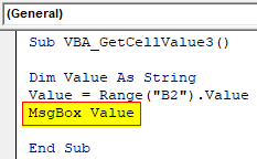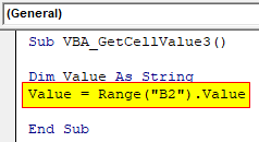 Sub VBA_GetCellValue3() Dim Value As String Value = Range("B2").Value End Sub