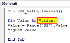 Sub VBA_GetCellValue3() Dim Value As Variant Value = Range("B2").Value MsgBox Value End Sub