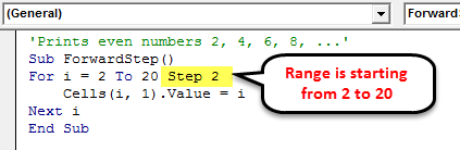 Sub ForwardStep() For i = 2 To 20 Step 2 Cells(i, 1).Value = i Next i End Sub