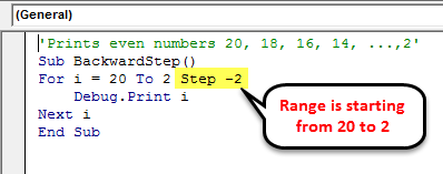 Sub BackwardStep() For i = 20 To 2 Step -2 Debug.Print i Next i End Sub