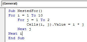 Sub NestedFor() For i = 1 To 10 For j = 1 To 2 Cells(i, j).Value = i * j Next j Next i End Sub