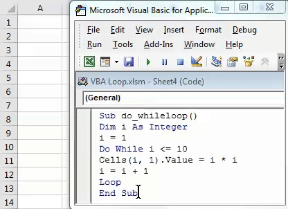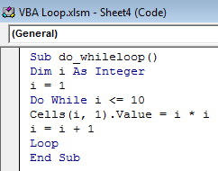 Sub do_whileloop() Dim i As Integer i = 1 Do While i <= 10 Cells(i, 1).Value = i * i i = i + 1 Loop End Sub