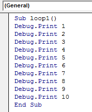 Sub loop1() Debug.Print 1 Debug.Print 2 Debug.Print 3 Debug.Print 4 Debug.Print 5 Debug.Print 6 Debug.Print 7 Debug.Print 8 Debug.Print 9 Debug.Print 10 End Sub