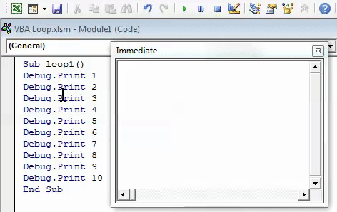 If you can get through the code quickly, I have added Debug.Print one by one to print numbers from 1 to 10. After running the code we can see the output in Immediate Window. To open Immediate Window, Press Ctrl+G anywhere in Excel.