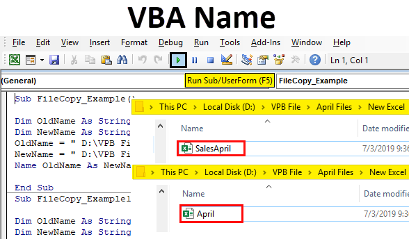 Sub FileCopy_Example() Dim OldName As String Dim NewName As String OldName = " D:\VPB File\April Files\New Excel\SalesApril.xlsx" NewName = " D:\VPB File\April Files\New Excel\April.xlsx" Name OldName As NewName End Sub