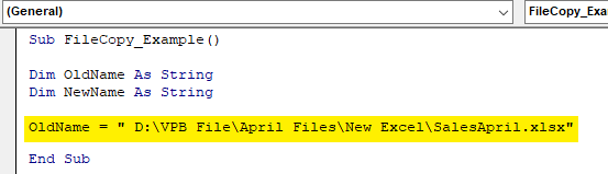 Sub FileCopy_Example1() Dim OldName As String Dim NewName As String OldName = " D:\VPB File\April Files\New Excel\SalesApril.xlsx" End Sub