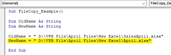 Sub FileCopy_Example1() Dim OldName As String Dim NewName As String OldName = " D:\VPB File\April Files\New Excel\SalesApril.xlsx" NewName = " D:\VPB File\April Files\New Excel\April.xlsx" End Sub