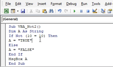 Sub VBA_Not2() Dim A As String If Not (10 = 10) Then A = "TRUE" Else A = "FALSE" End If End Sub