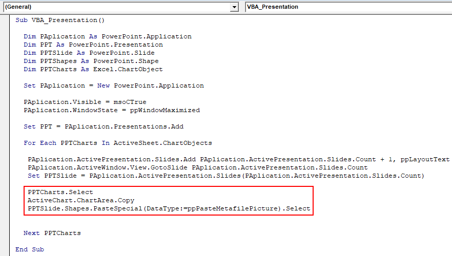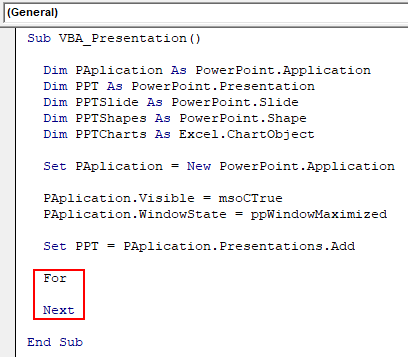 Sub VBA_Presentation() Dim PAplication As PowerPoint.Application Dim PPT As PowerPoint.Presentation Dim PPTSlide As PowerPoint.Slide Dim PPTShapes As PowerPoint.Shape Dim PPTCharts As Excel.ChartObject Set PAplication = New PowerPoint.Application PAplication.Visible = msoCTrue PAplication.WindowState = ppWindowMaximized Set PPT = PAplication.Presentations.Add For Next End Sub
