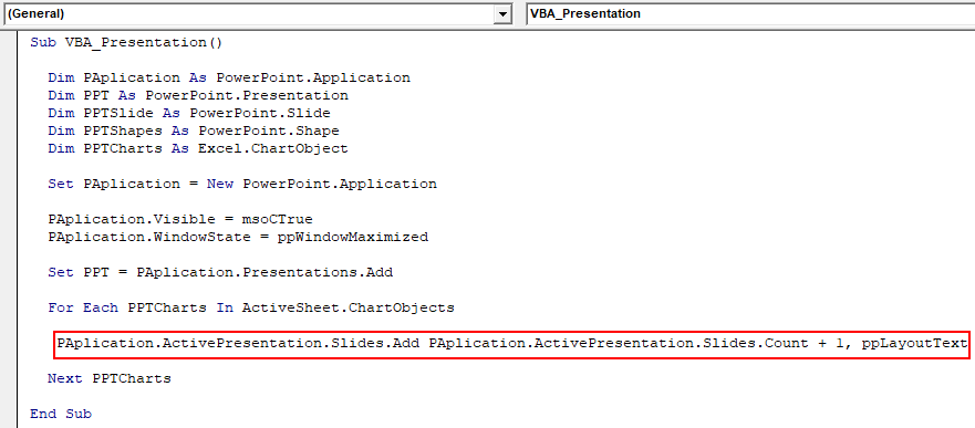 Sub VBA_Presentation() Dim PAplication As PowerPoint.Application Dim PPT As PowerPoint.Presentation Dim PPTSlide As PowerPoint.Slide Dim PPTShapes As PowerPoint.Shape Dim PPTCharts As Excel.ChartObject Set PAplication = New PowerPoint.Application PAplication.Visible = msoCTrue PAplication.WindowState = ppWindowMaximized Set PPT = PAplication.Presentations.Add For Each PPTCharts In ActiveSheet.ChartObjects PAplication.ActivePresentation.Slides.Add PAplication.ActivePresentation.Slides.Count + 1, ppLayoutText Next PPTCharts End Sub