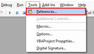 Step 1: Go to VBA Tool menu as shown below and select References… option as shown below.