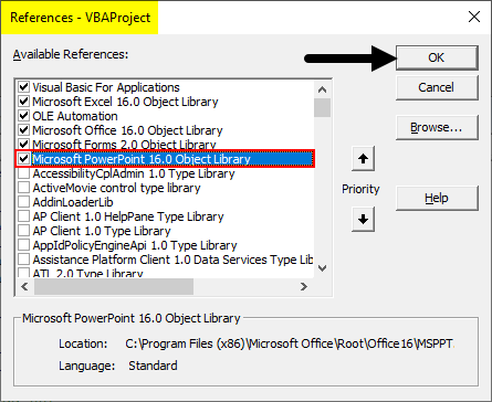 Step 2: Once we do that we will get a References VBA Project windows. From that list select MS PowerPoint 15.0 Object Library as shown below. This will activate all the commands related to MS PowerPoint in VBA. Without this, we cannot run VBA in PowerPoint. Check the box of mentioned Library and click on Ok.