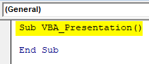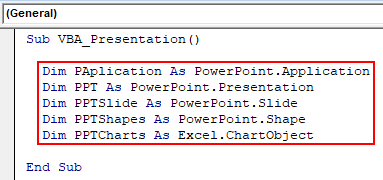 Sub VBA_Presentation() Dim PAplication As PowerPoint.Application Dim PPT As PowerPoint.Presentation Dim PPTSlide As PowerPoint.Slide Dim PPTShapes As PowerPoint.Shape Dim PPTCharts As Excel.ChartObject End Sub