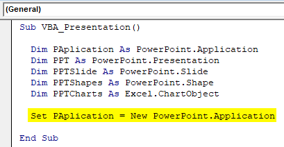 Sub VBA_Presentation() Dim PAplication As PowerPoint.Application Dim PPT As PowerPoint.Presentation Dim PPTSlide As PowerPoint.Slide Dim PPTShapes As PowerPoint.Shape Dim PPTCharts As Excel.ChartObject Set PAplication = New PowerPoint.Application End Sub