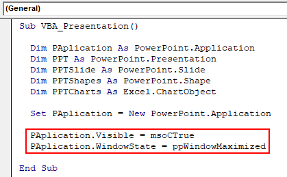 Sub VBA_Presentation() Dim PAplication As PowerPoint.Application Dim PPT As PowerPoint.Presentation Dim PPTSlide As PowerPoint.Slide Dim PPTShapes As PowerPoint.Shape Dim PPTCharts As Excel.ChartObject Set PAplication = New PowerPoint.Application PAplication.Visible = msoCTrue PAplication.WindowState = ppWindowMaximized End Sub