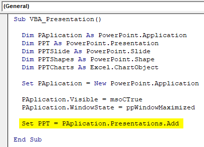 Sub VBA_Presentation() Dim PAplication As PowerPoint.Application Dim PPT As PowerPoint.Presentation Dim PPTSlide As PowerPoint.Slide Dim PPTShapes As PowerPoint.Shape Dim PPTCharts As Excel.ChartObject Set PAplication = New PowerPoint.Application PAplication.Visible = msoCTrue PAplication.WindowState = ppWindowMaximized Set PPT = PAplication.Presentations.Add End Sub
