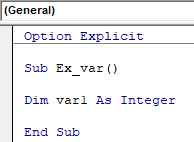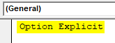 Step 2: Within the newly created module, add Option Explicit command at the start of your VBA code (before creating any variable). Option Explicit helps you if there is any typo while using the defined variable. If the used variable is not defined in the system, this option throws an error message saying the variable is not defined.