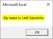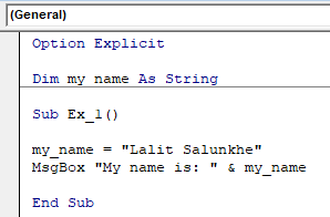 Option Explicit Dim my_name As String Sub Ex_1() my_name = "Lalit Salunkhe" MsgBox "My name is: " & my_name End Sub