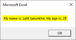 Option Explicit Dim my_name As String Sub Ex_1() my_name = "Lalit Salunkhe" MsgBox "My name is: " & my_name End Sub Sub Ex_2() Dim my_age As Integer my_name = "Lalit Salunkhe" my_age = 28 MsgBox "My name is: " & my_name & "; My age is: " & my_age End Sub