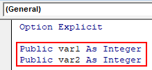 Step 3: Define a new variable named var1 and var2 both as a type integer. But this time using Public statement instead of Dim (which we used previously).