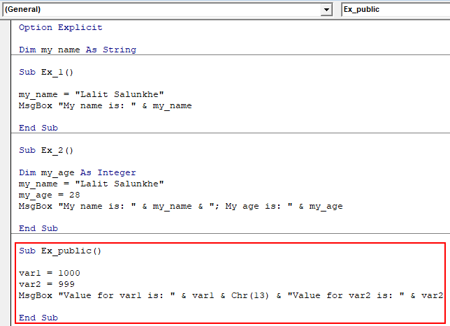 Option Explicit Dim my_name As String Sub Ex_1() my_name = "Lalit Salunkhe" MsgBox "My name is: " & my_name End Sub Sub Ex_2() Dim my_age As Integer my_name = "Lalit Salunkhe" my_age = 28 MsgBox "My name is: " & my_name & "; My age is: " & my_age End Sub Sub Ex_public() var1 = 1000 var2 = 999 MsgBox "Value for var1 is: " & var1 & Chr(13) & "Value for var2 is: " & var2 End Sub
