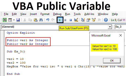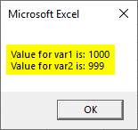 Option Explicit Public var1 As Integer Public var2 As Integer Sub Ex_3() var1 = 10 var2 = 100 MsgBox "Value for var1 is: " & var1 & Chr(13) & "Value for var2 is: " & var2 End Sub