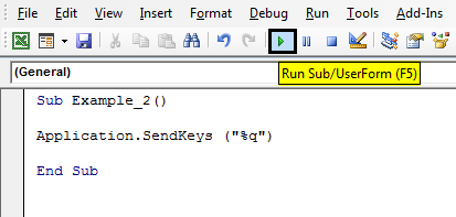 Sub Example_2() Application.SendKeys ("%q") End Sub