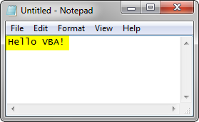 Sub Example_3() Call Shell("C:\Windows\System32\Notepad.exe", vbNormalFocus) Call SendKeys("Hello VBA!", True) End Sub