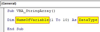 Sub VBA_StringArray() Dim NameOfVariable(1 To 10) As DataType End Sub