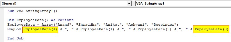 Sub VBA_StringArray1() Dim EmployeeData() As Variant EmployeeData = Array("Anand", "Shraddha", "Aniket", "Ashwani", "Deepinder") MsgBox EmployeeData(4) & ", " & EmployeeData(1) & ", " & EmployeeData(3) & ", " & EmployeeData(0) End Sub