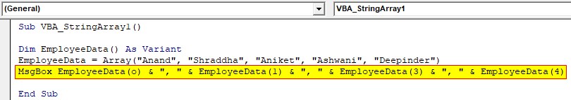 Sub VBA_StringArray1() Dim EmployeeData() As Variant EmployeeData = Array("Anand", "Shraddha", "Aniket", "Ashwani", "Deepinder") MsgBox EmployeeData(0) & ", " & EmployeeData(1) & ", " & EmployeeData(3) & ", " & EmployeeData(4) End Sub