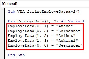 Sub VBA_StringEmployeDataay2() Dim EmployeData(1, 3) As Variant EmployeData(0, 1) = "Anand" EmployeData(0, 2) = "Shraddha" EmployeData(1, 2) = "Aniket" EmployeData(1, 3) = "Ashwani" EmployeData(0, 0) = "Deepinder" End Sub
