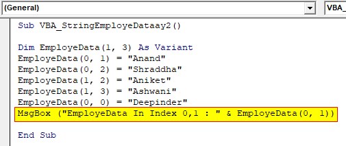 Sub VBA_StringEmployeDataay2() Dim EmployeData(1, 3) As Variant EmployeData(0, 1) = "Anand" EmployeData(0, 2) = "Shraddha" EmployeData(1, 2) = "Aniket" EmployeData(1, 3) = "Ashwani" EmployeData(0, 0) = "Deepinder" MsgBox ("EmployeData In Index 0,1 : " & EmployeData(0, 1)) End Sub