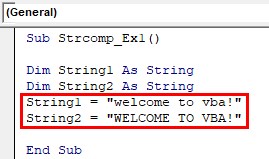 Sub Strcomp_Ex1() Dim String1 As String Dim String2 As String String1 = "welcome to vba!" String2 = "WELCOME TO VBA!" End Sub