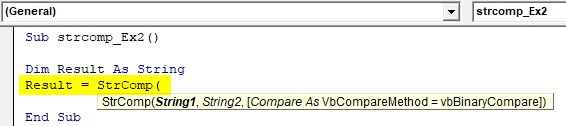 Step 2: Define a variable Result as String so that we can assign a value of StrComp function to it.