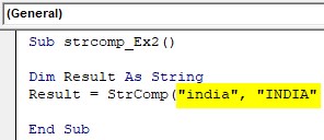 Sub strcomp_Ex2() Dim Result As String Result = StrComp("india", "INDIA" End Sub