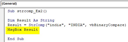 Sub strcomp_Ex2() Dim Result As String Result = StrComp("india", "INDIA", vbBinaryCompare) MsgBox Result End Sub