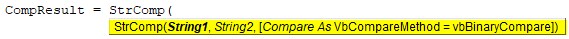 Sub strcomp_Ex2() Dim Result As String Result = StrComp( End Sub