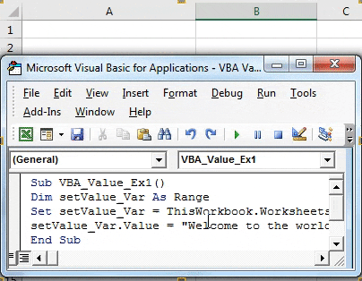 Sub VBA_Value_Ex1() Dim setValue_Var As Range Set setValue_Var = ThisWorkbook.Worksheets("Setting_Cell_Value_1").Range("A1") setValue_Var.Value = "Welcome to the world of VBA!" End Sub