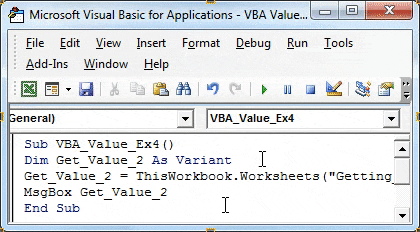 Sub VBA_Value_Ex3() Dim Get_Value As Variant Get_Value = ThisWorkbook.Worksheets("Getting_Cell_Value").Range("A1").Value MsgBox Get_Value End Sub