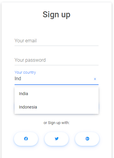 So in the above screenshots, we can see the form with nothing entered in the country name field “your country” So when we type the country name, it automatically searches for such similar name ad display the list to select for the user, and this we saw in the second screenshot when we are typing the country name “Ind” it will give a list with country names starting with same alphabets, and the list has “India” and “Indonesia” so we can select “India” easily. This is how we use the autocomplete component in designing the vue.js app helps the user search suggestion easily.
