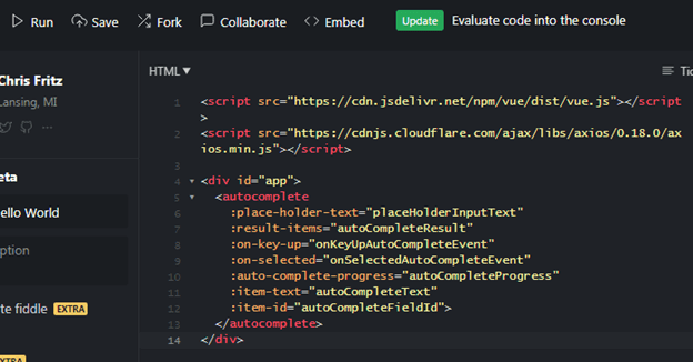 So this is one of the sample examples to show how we can create a vue.js app with an autocomplete component in the below code.