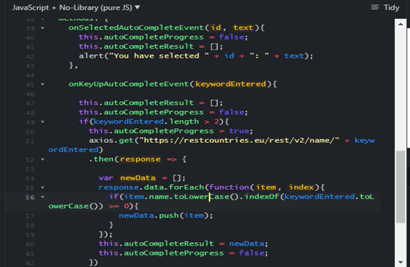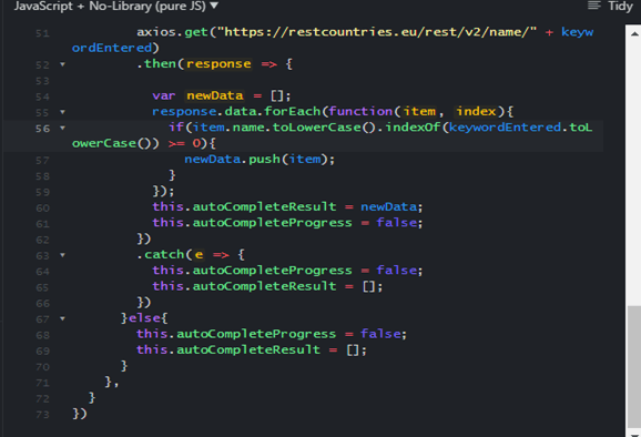 And then, we also have to declare methods and few data variables in the vue.js file which are used in the autocomplete component, and to write that; we have to write the code as below: