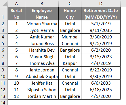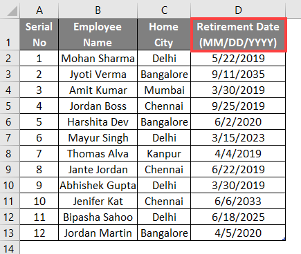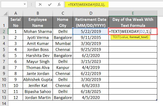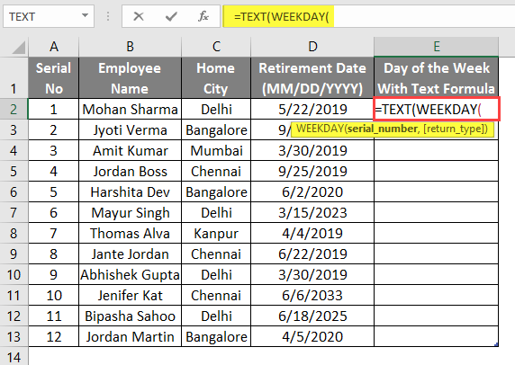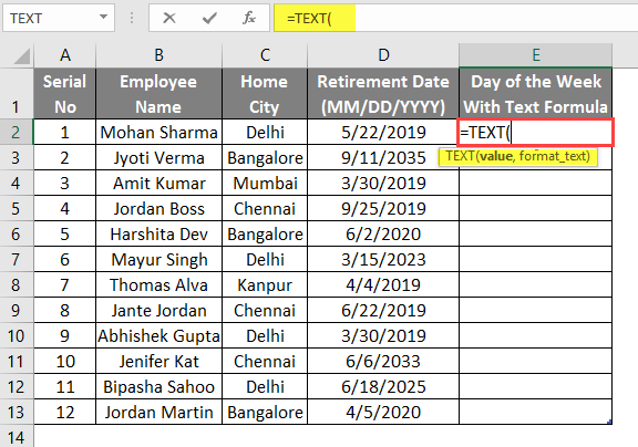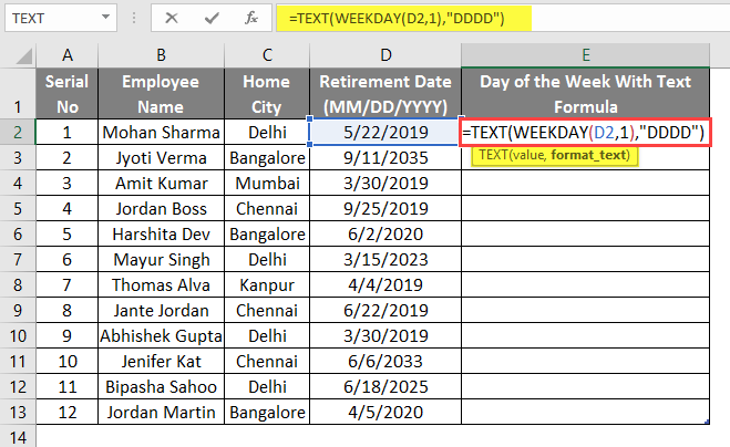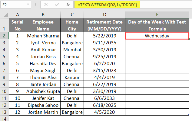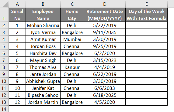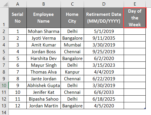 A company owner has the personal details of his employee where the Employee’s name, Home city, and Retirement Date are given. He wants to get the day of that week for the Retirement Date in text format.