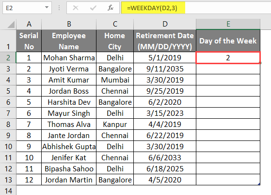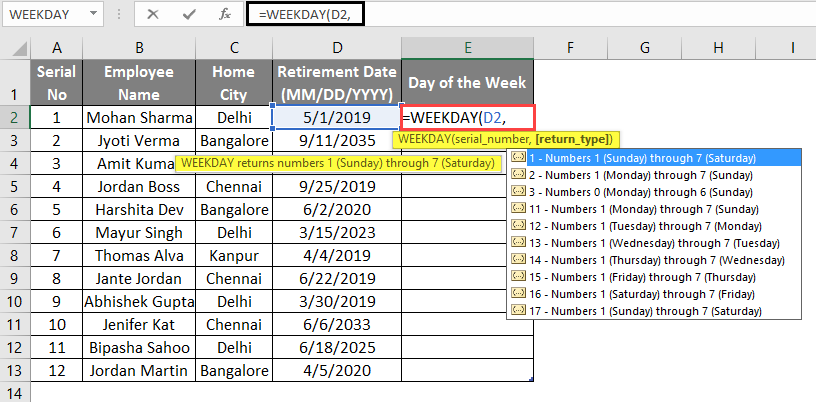 Now it will ask for serial_number, select the retirement date from where a company owner wants to see the day of the week, which is available in cell D2.