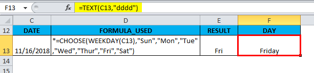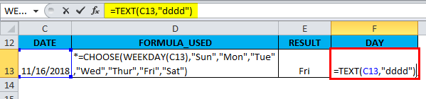 If you need to display the full form of a day of the week, i.e. as “FRIDAY”, you can format the cell as “dddd”, OR below mentioned formula below is used in the cell “F13.”