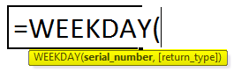 Double click on WEEKDAY Function, A dialog box appears where arguments for WEEKDAY Function needs to be filled or entered i.e. =WEEKDAY (serial_number, [return_type])